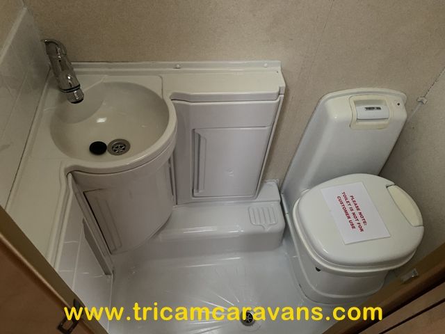 The side washroom includes a swivel cassette toilet, a wash basin, a pull-up shower, cabinets for toiletries, a side window, and a roof light.