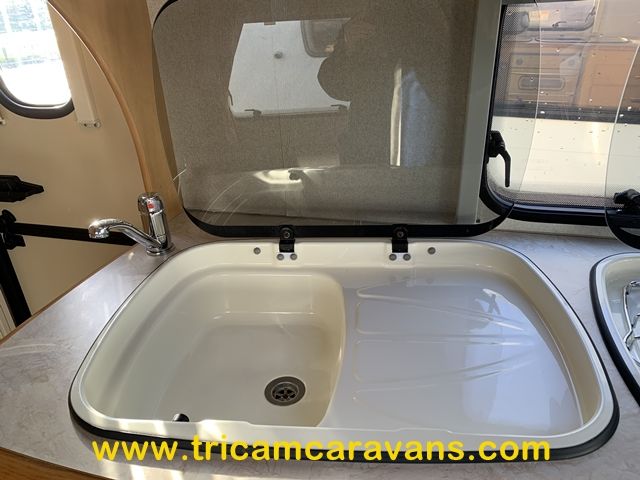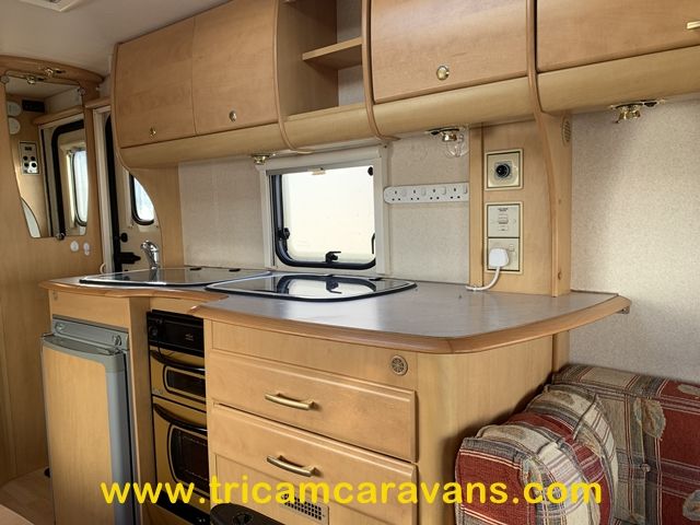 The centre kitchen is equipped with a 3-way fridge, a full gas cooker, a large sink with integral drainer, and ample worktop and storage.