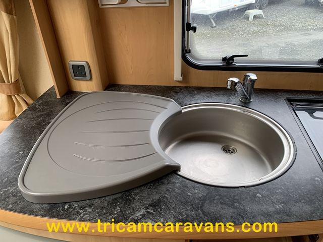 The fully-equipped centre kitchen includes a full cooker with a dual fuel hob, a 3-way fridge, a built-in microwave, a large circular stainless steel sink with removable cover and drainer, and ample worktop and storage on both sides of the caravan.