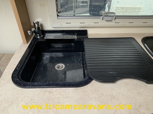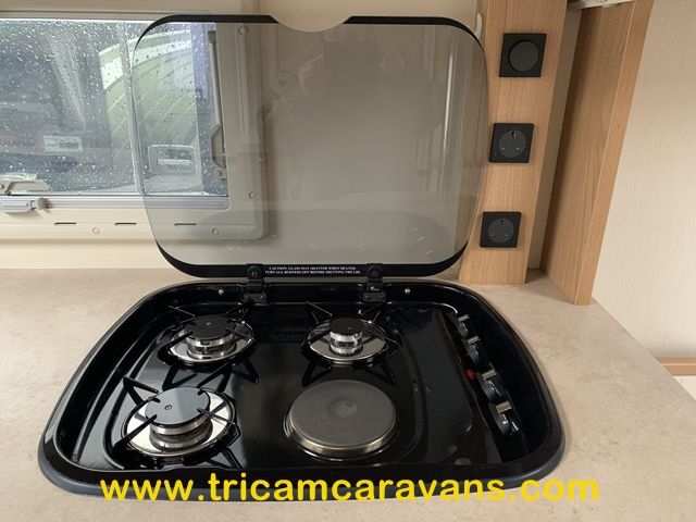 The centre kitchen is equipped with a 3-way fridge, a full cooker with a dual fuel hob, a large rectangular sink with removable cover/drainer, and ample worktop, including the glass hob cover.