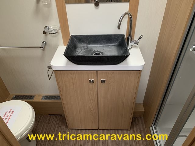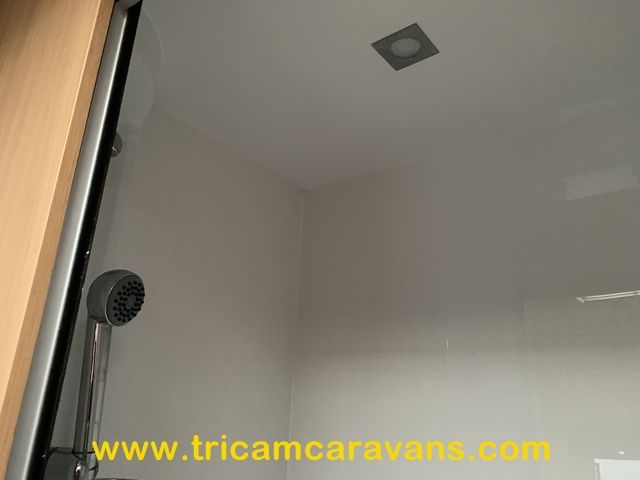 The full end washroom includes a separate shower cubicle, a swivel cassette toilet, a wash basin, cabinets for toiletries, a side window, and a roof light.