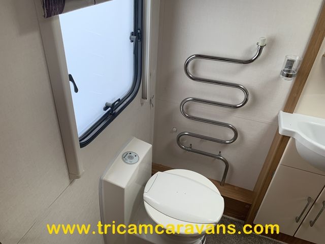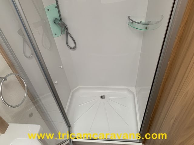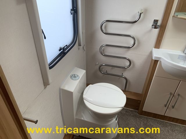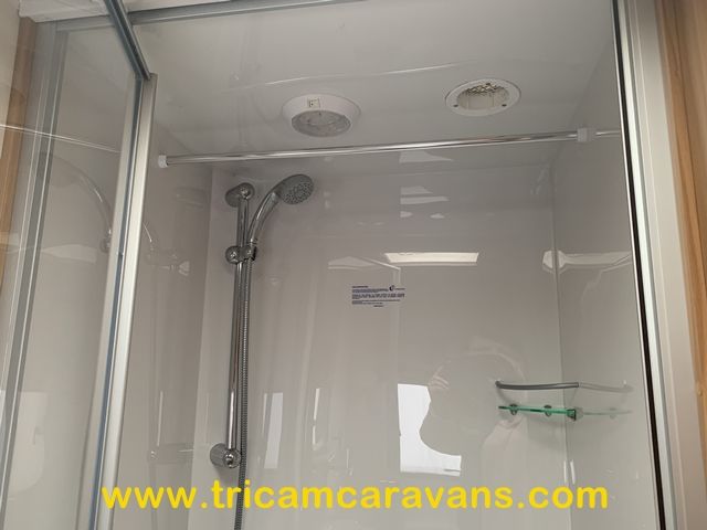 The full end washroom includes a large separate shower cubicle, a heated towel rail, a swivel cassette toilet, a wash basin, cabinets for toiletries, and both a roof light and a side window.