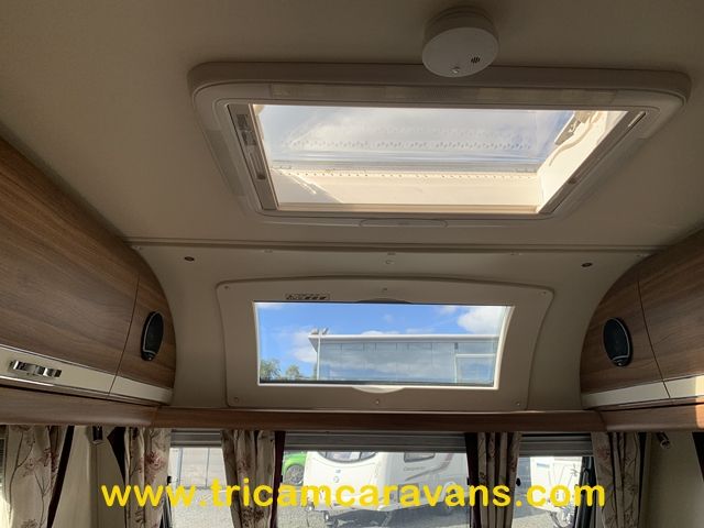 This excellent 2 berth features a front sunroof with an additional roof light above, bringing plenty of daylight into the front lounge, where the long seats can be used as two single beds or converted to a generous double. The furniture and soft furnishings are immaculate. A cream and metallic contrast on the wood finish overhead locker doors co-ordinates with the worktops and table.