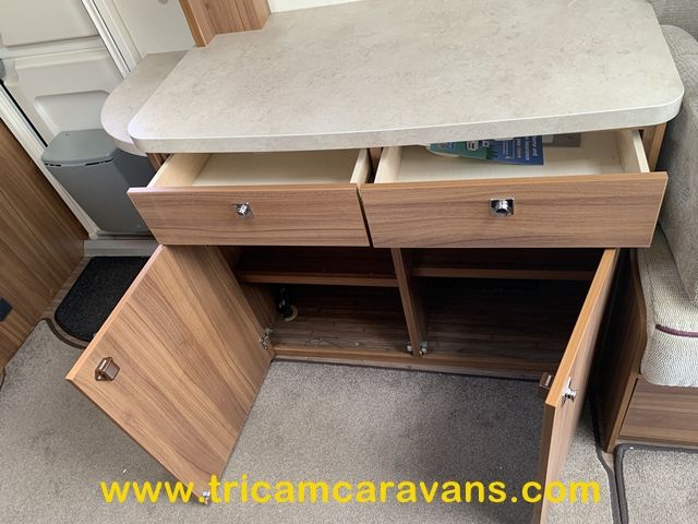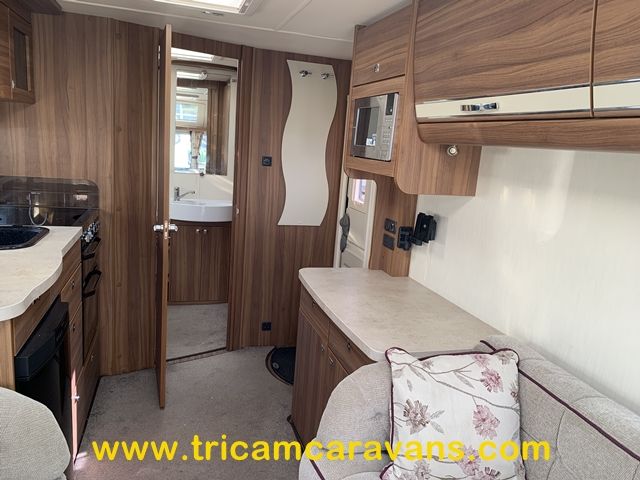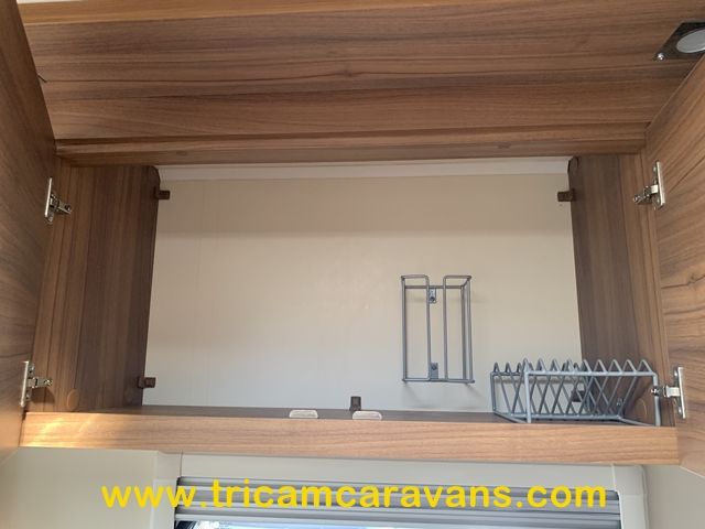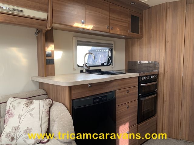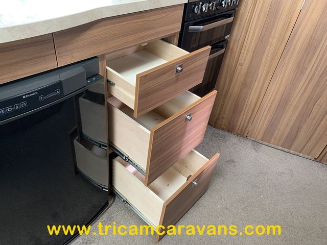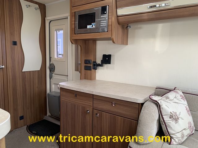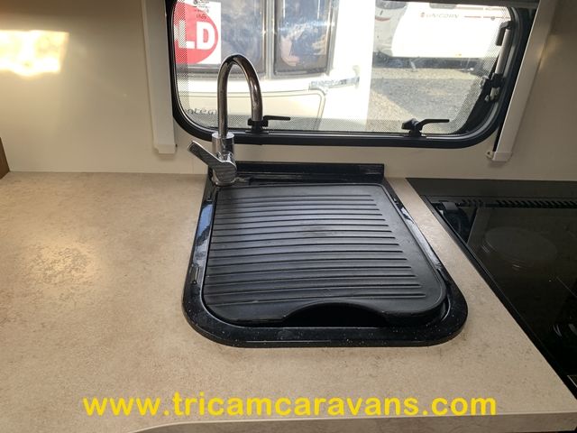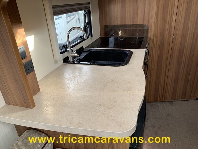 The centre kitchen includes a full cooker with a dual fuel hob, a built-in microwave, a 3-way fridge, a large rectangular sink with a removable drainer, and extensive worktop and storage space on both sides of the caravan.