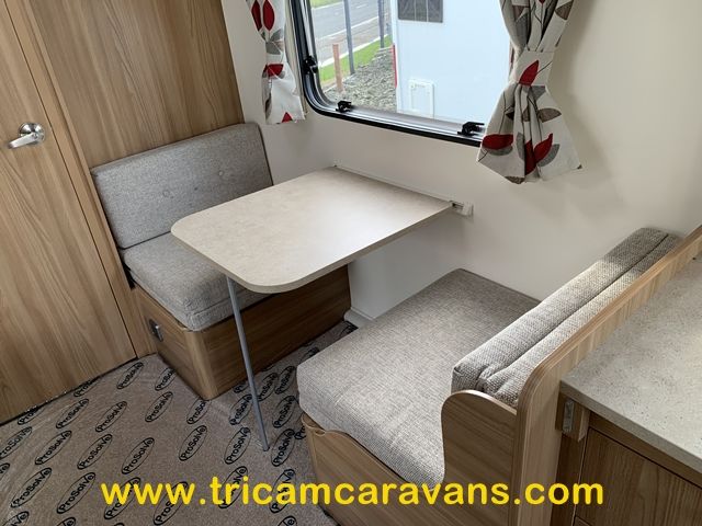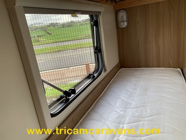 Two fixed bunks to the offside rear each have their own window and reading light, while a dinette opposite offers additional seating, and converts to a single bed.