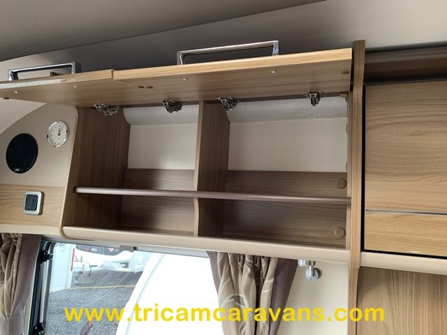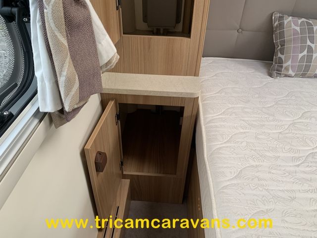 A fixed island bed to the rear has a wardrobe and a window to each side and a roof light above. Further storage is supplied by overhead lockers and underbed space.