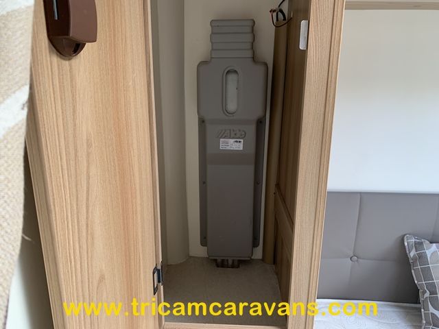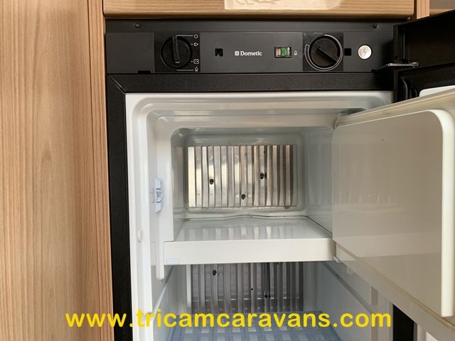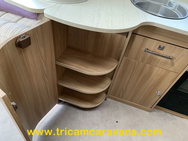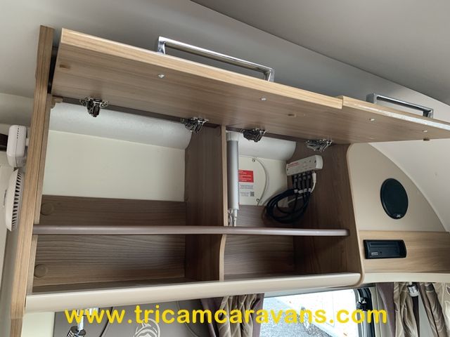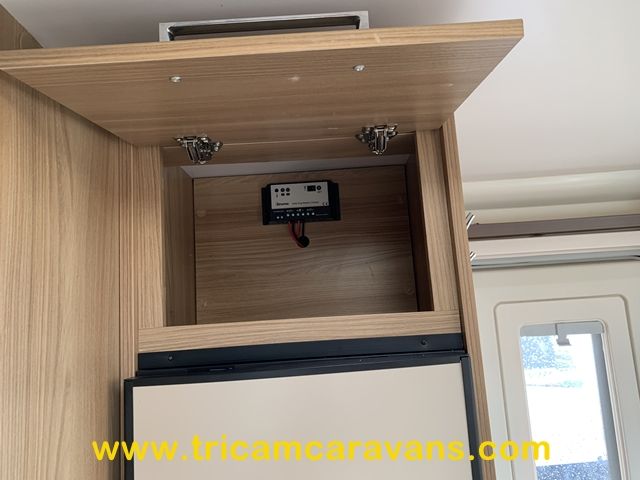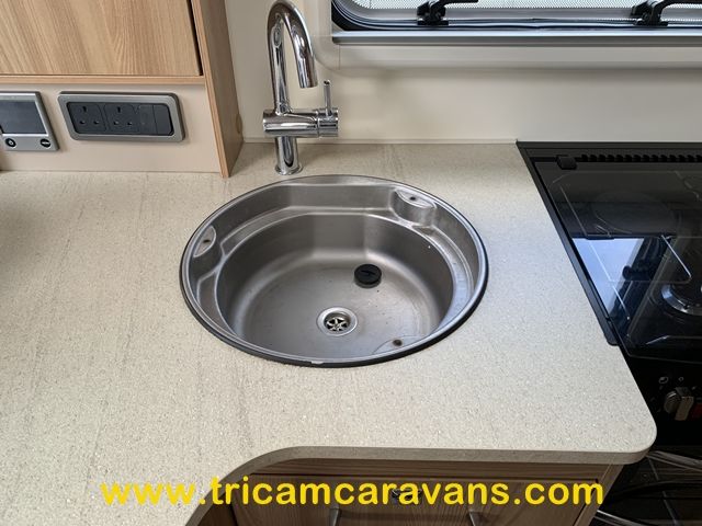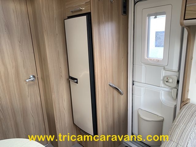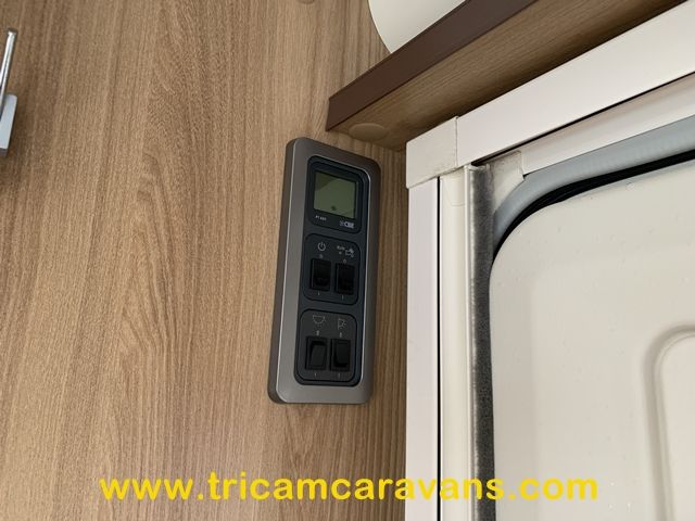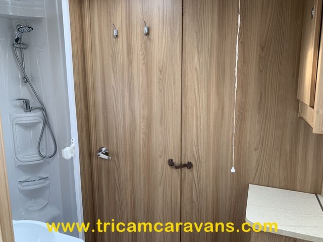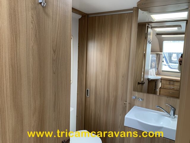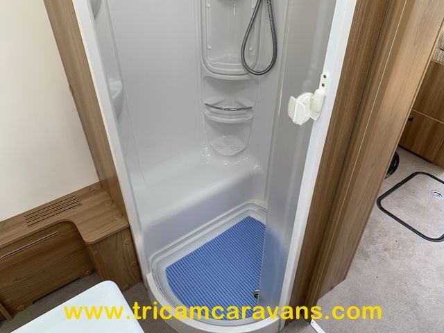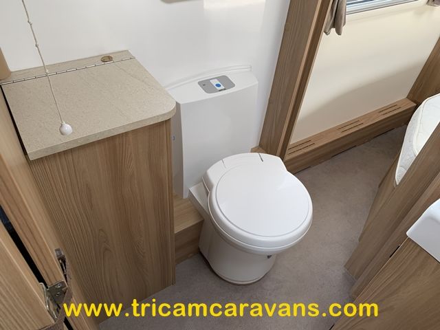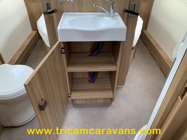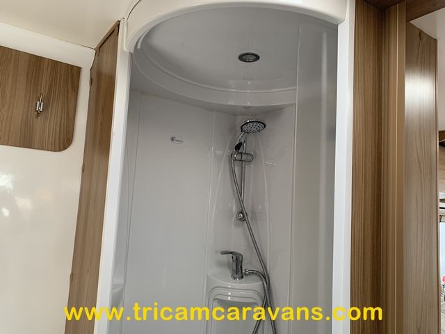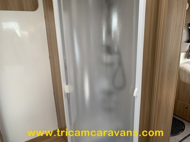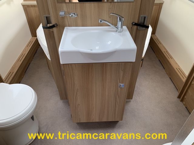 Forward of the bedroom, a shower cubicle is located on the nearside, with a swivel cassette toilet on the offside and a wash basin in the centre. A solid door closeoff the bathroom from the living space, while a sliding door at each side divide it from the bedroom. There is a side window above the toilet, and a middle roof light.