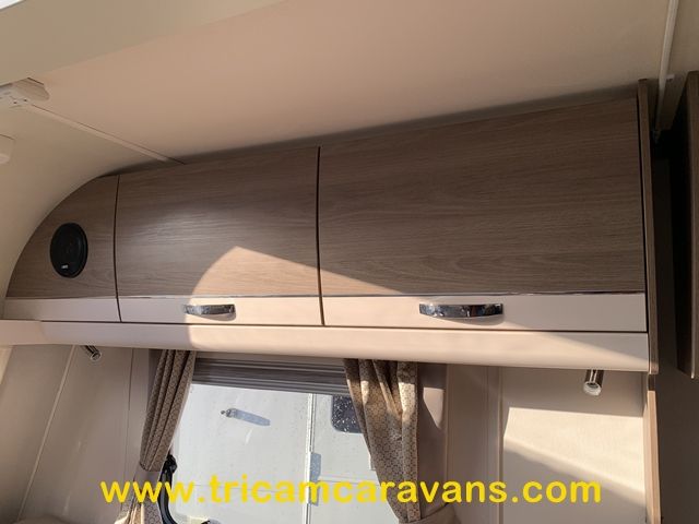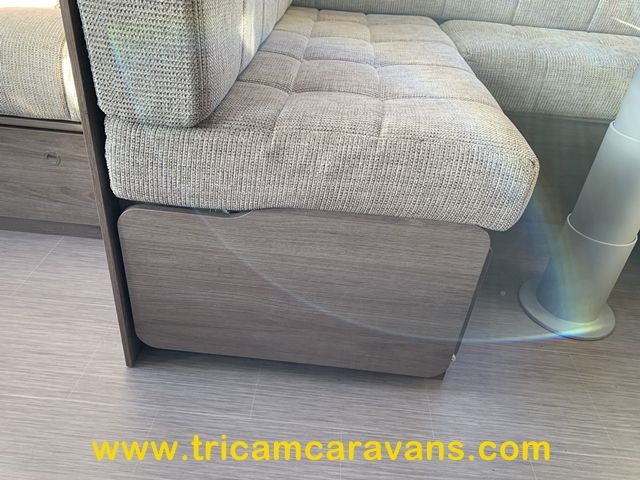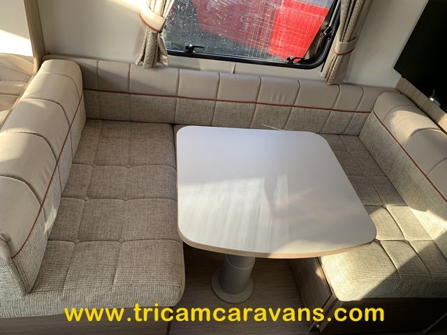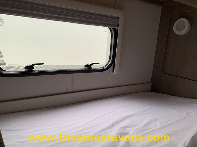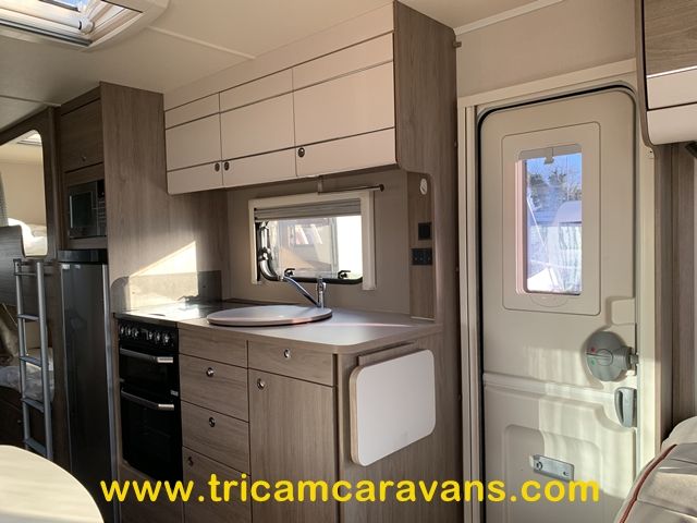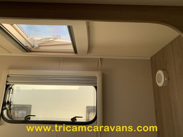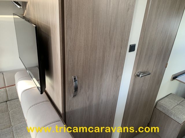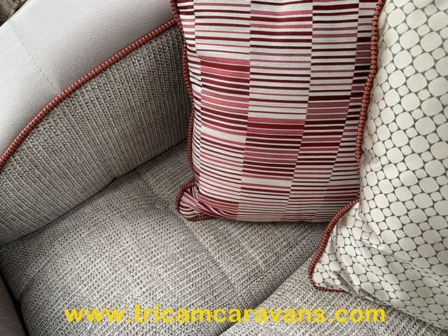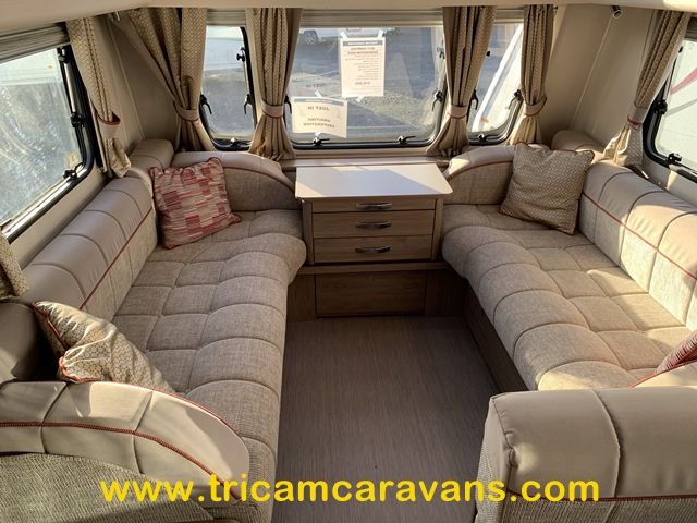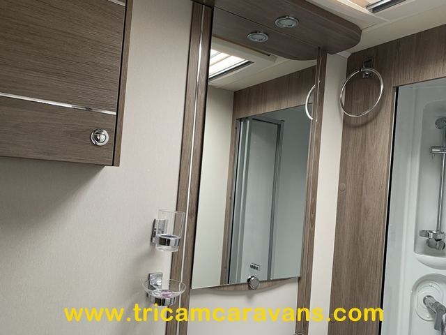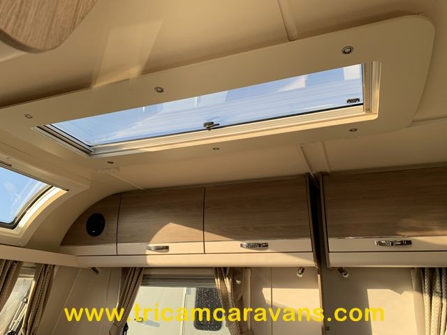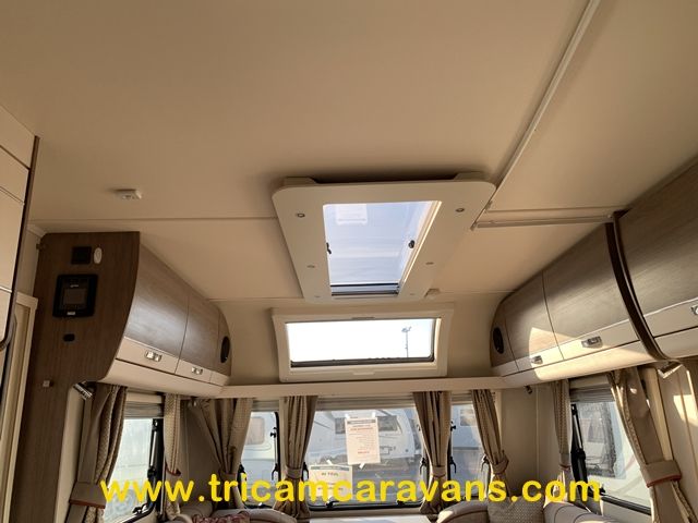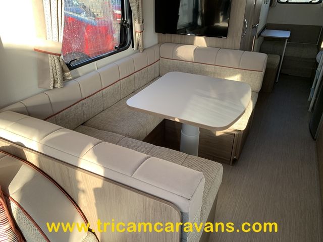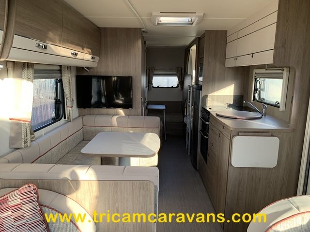 This spacious, eight foot wide twin axle 6 berth is bright and airy, with a front sunroof and a panoramic roof light. The furniture and the luxurious soft furnishings are immaculate.