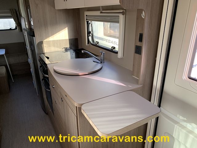 A fully-equipped centre kitchen includes a built-in microwave, a tall 3-way fridge with a removable freezer compartment, a full cooker with a dual fuel hob, a large circular sink, and ample storage and worktop, including a fold-up extension.