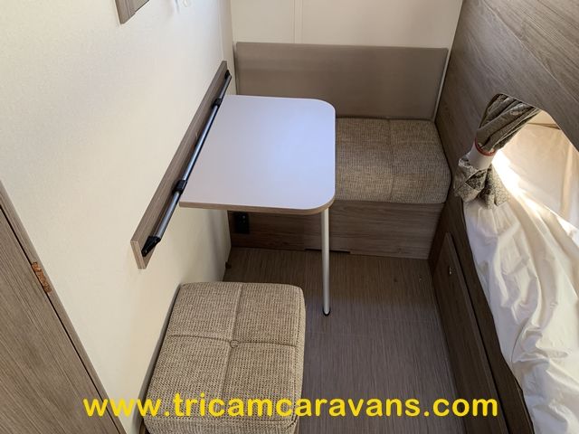 Two fixed bunks on the nearside each have their own window and reading light, and memory foam mattresses. There is a small adjacent seating area and table.