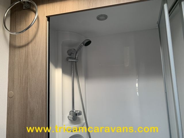 The offside end washroom features a separate shower cubicle, a swivel cassette toilet, a wash basin, high- and low-level cabinets, and a roof light.