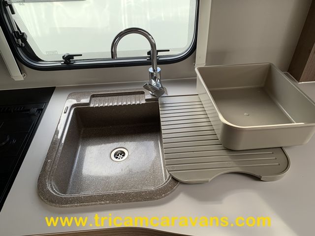 The fully-equipped centre kitchen includes a full cooker with a dual fuel hob, a 3-way fridge, a built-in microwave, a large rectangular sink with a removable drainer, and ample worktop and storage.