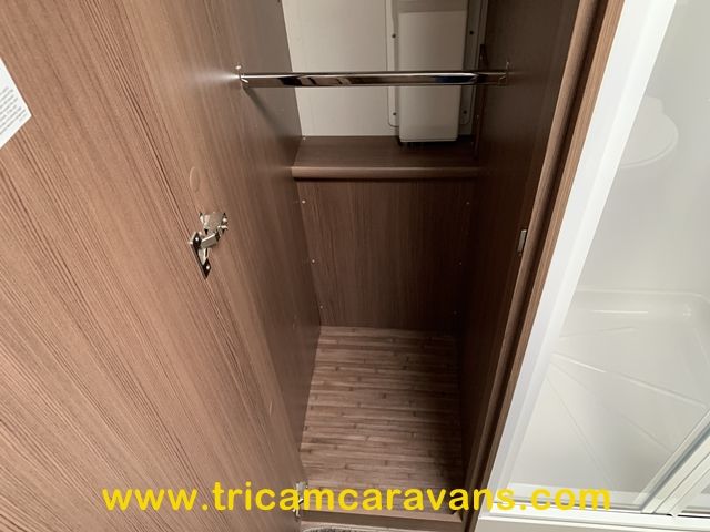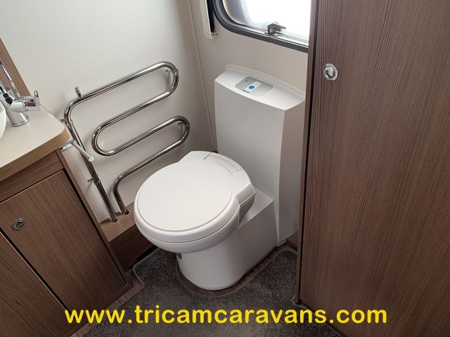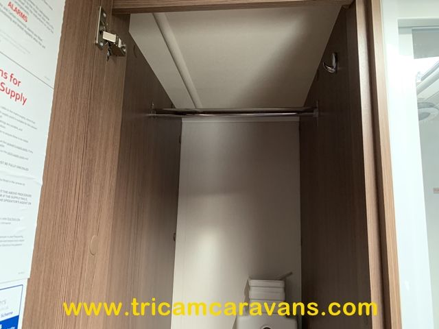 A full end washroom has a swivel cassette toilet, a wash basin, a separate shower cubicle, a heated towel rail, a wardrobe with double hanging rails, and cabinets for toiletries, as well as a side window and a rooflight.