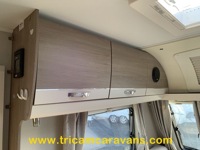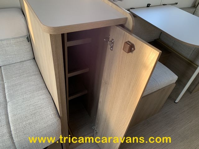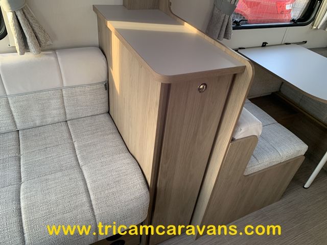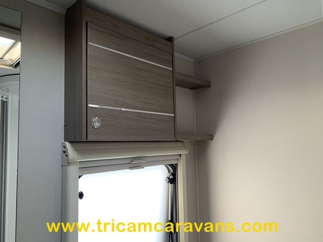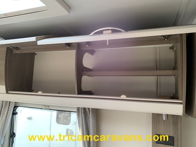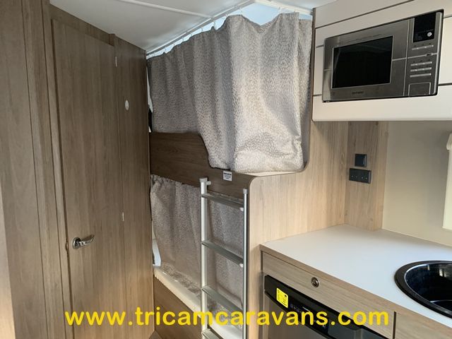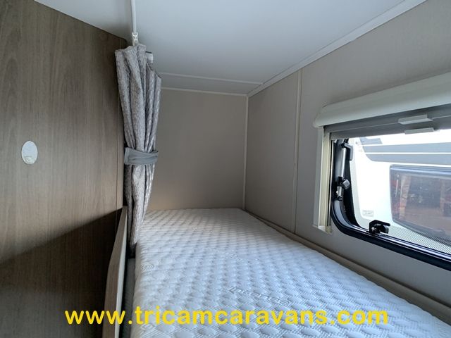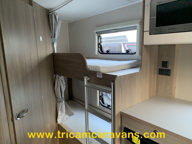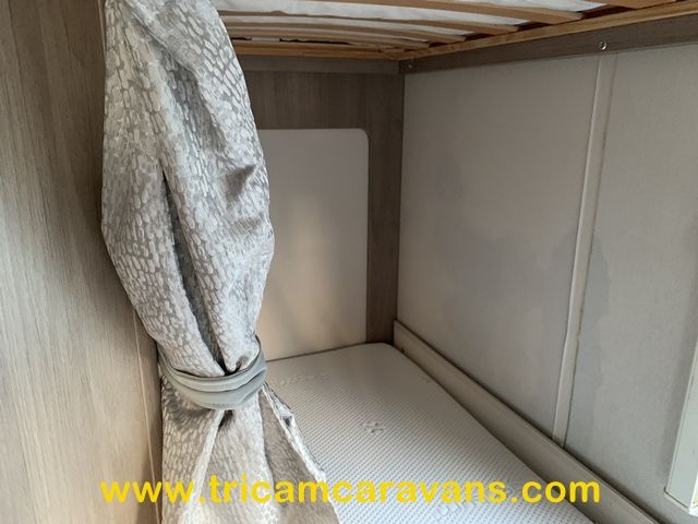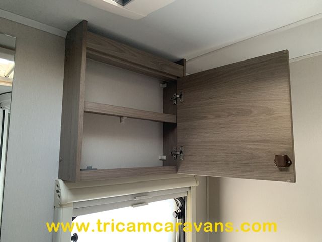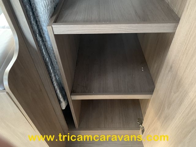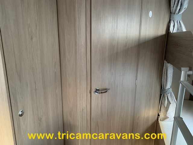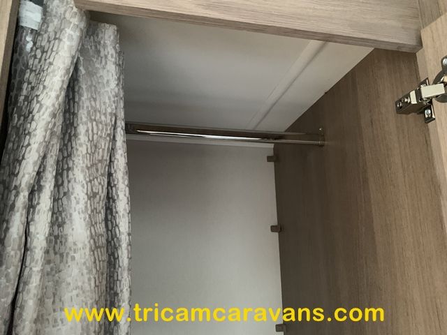 At the rear, two fixed bunks on the nearside each have their own window, with a wardrobe opposite offering shelf and hanging space. There is further storage space under the lower bunk.