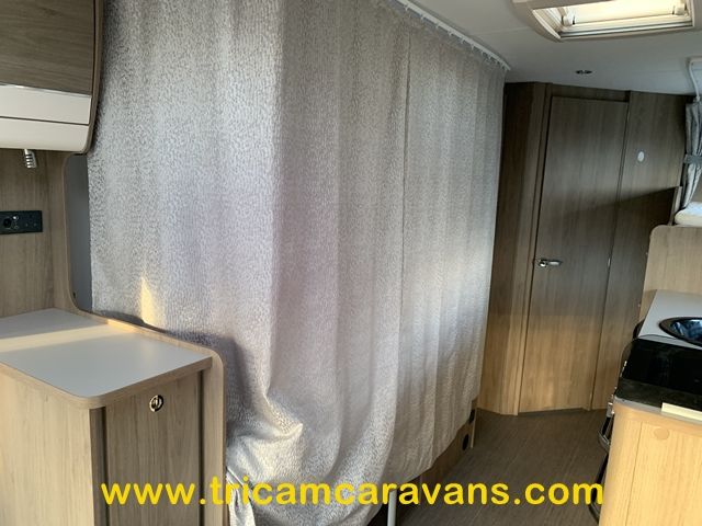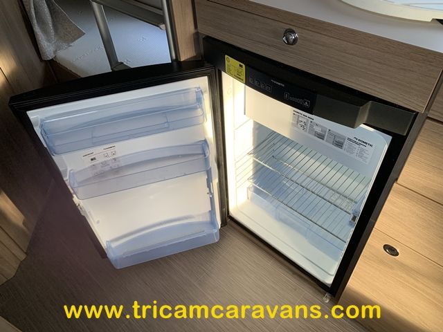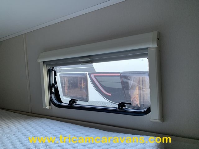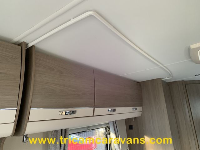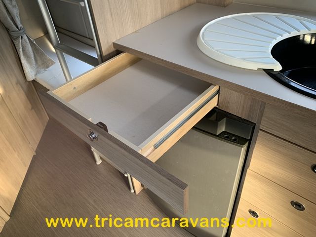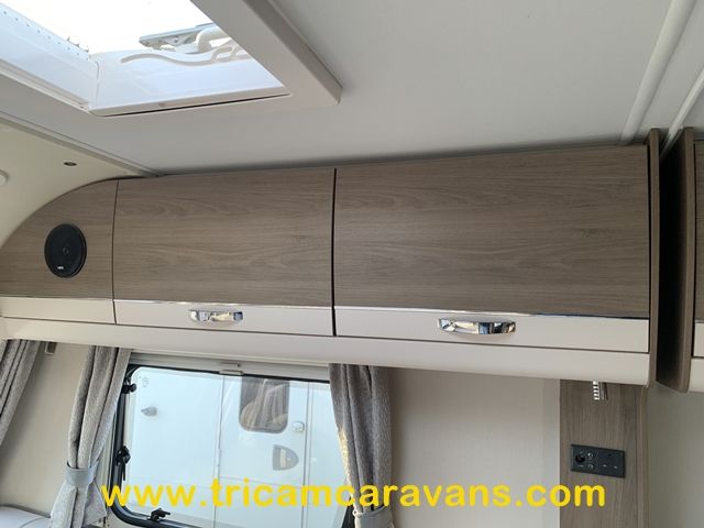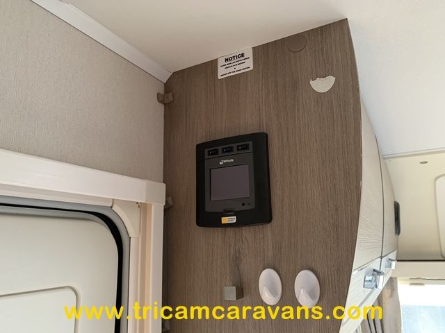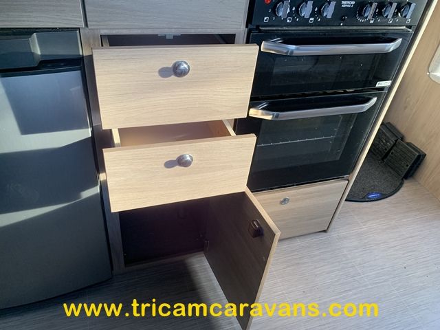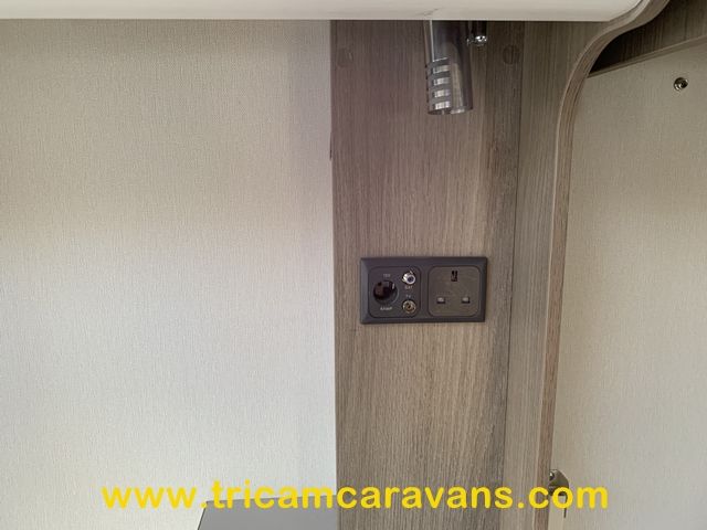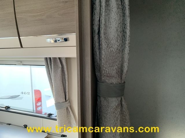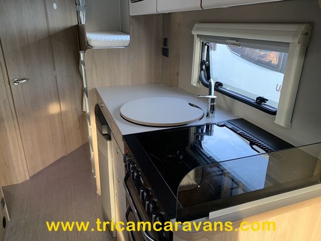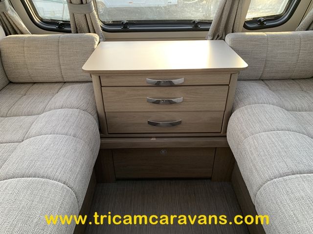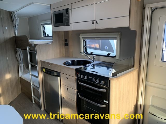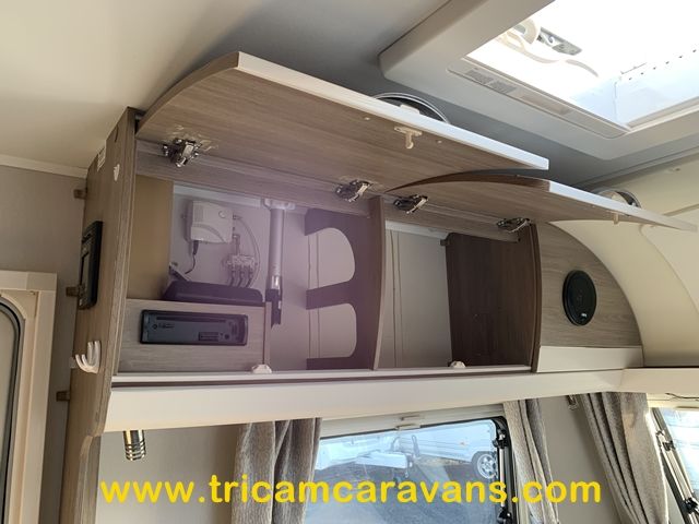 At the rear, two fixed bunks on the nearside each have their own window, with a wardrobe opposite offering shelf and hanging space. There is further storage space under the lower bunk.
