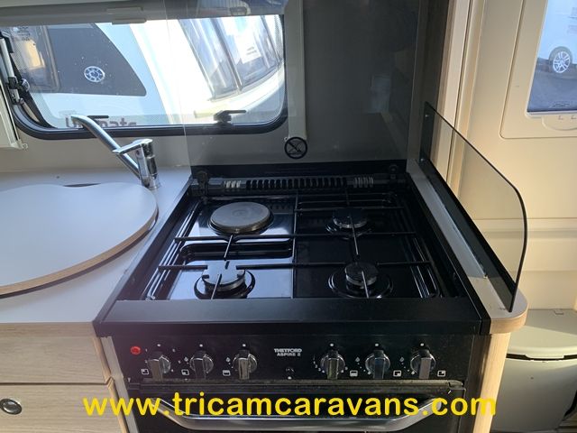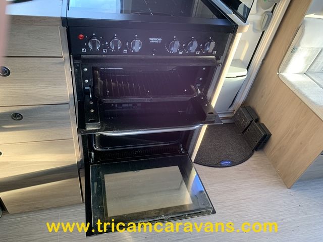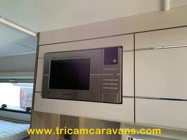 A fully-equipped centre kitchen includes a 3-way fridge, a full cooker with a dual fuel hob, a built-in microwave, a large circular sink with removable cover and drainer, and ample storage and worktop.