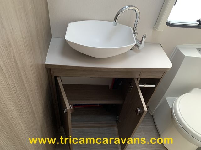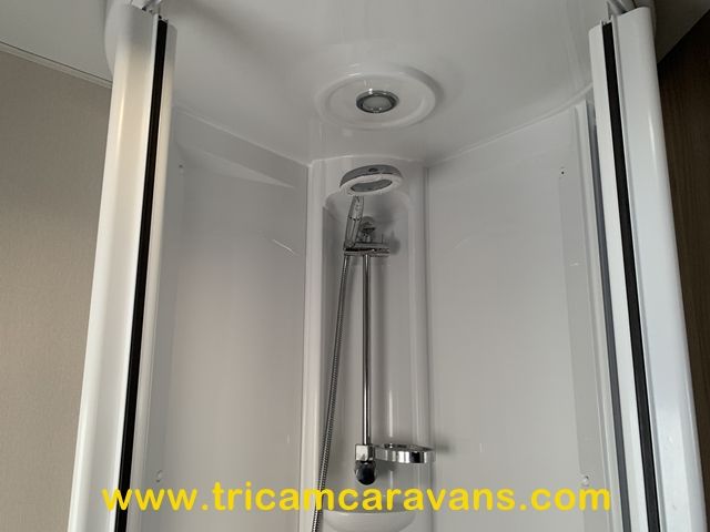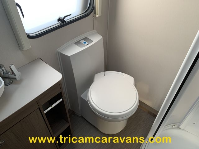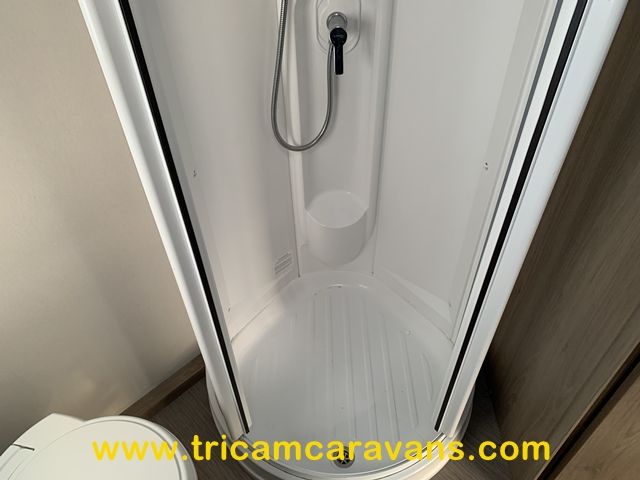 The offside end washroom features a separate shower cubicle, a swivel cassette toilet, a wash basin, cabinets for toiletries, a side window, and a roof light.