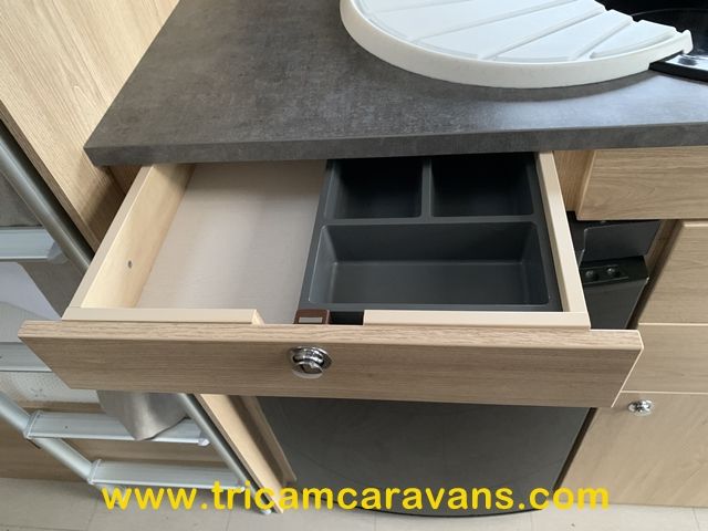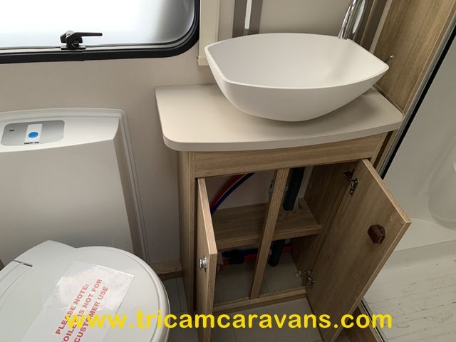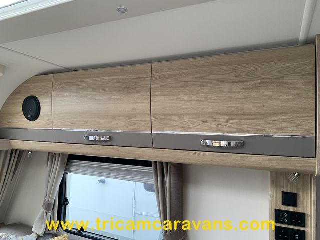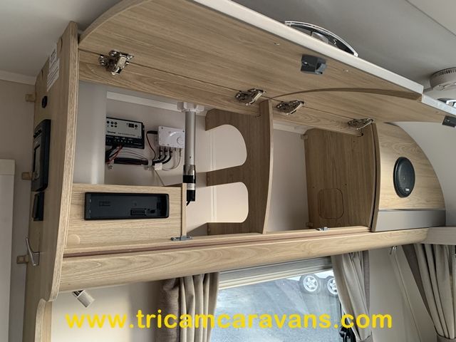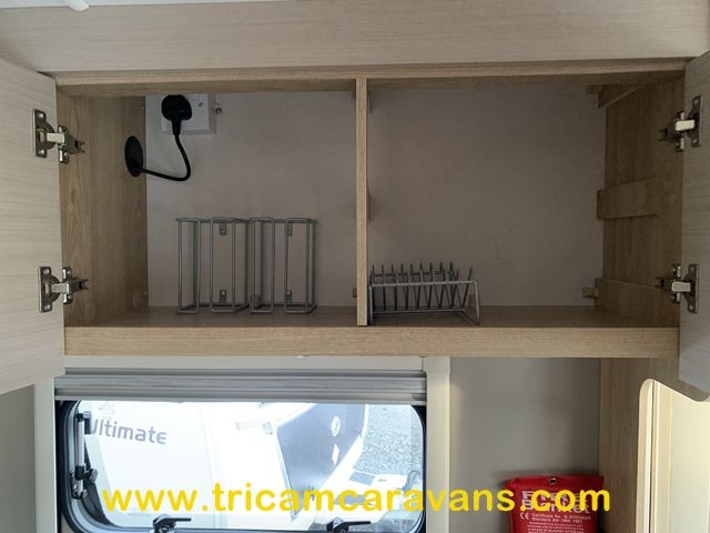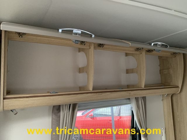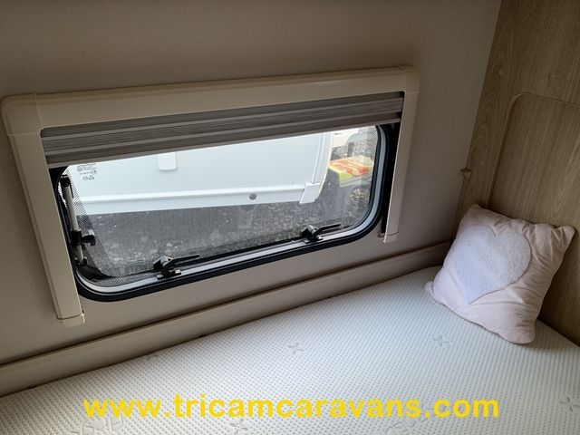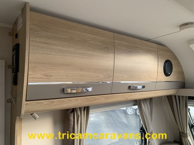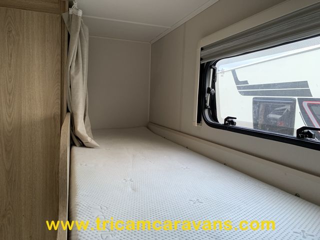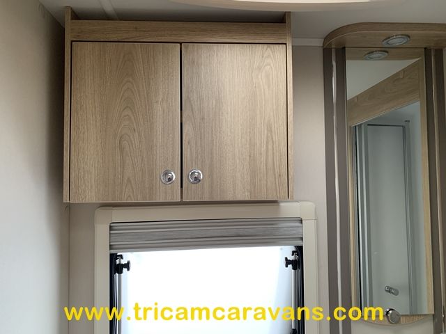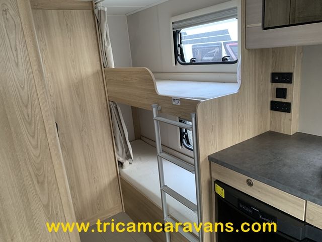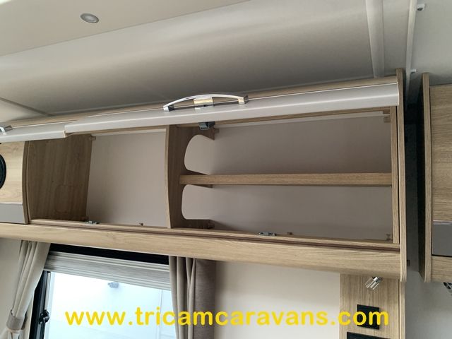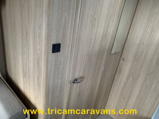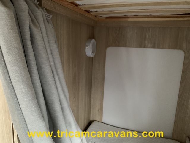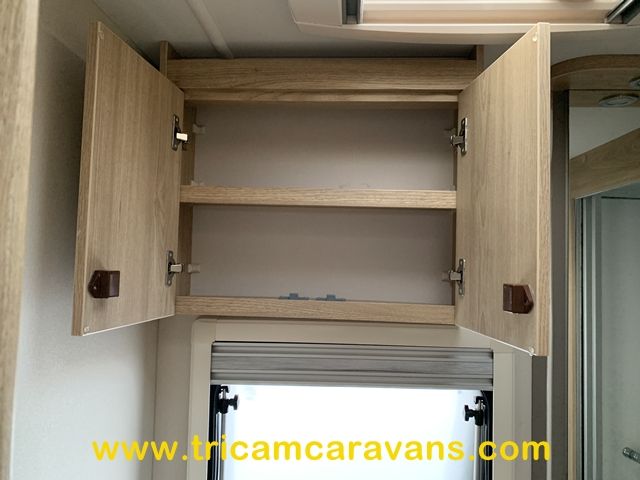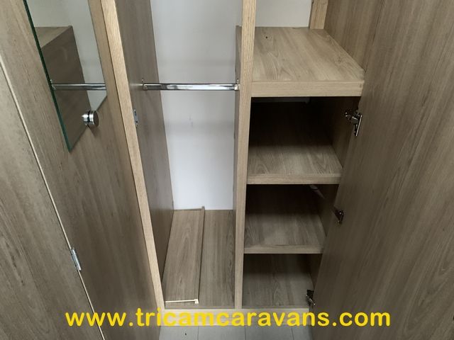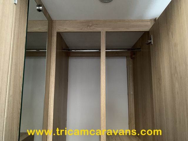 At the rear, two fixed bunks on the nearside each have their own window, with an adjacent wardrobe offering shelf and hanging space. There is further storage space under the lower bunk.