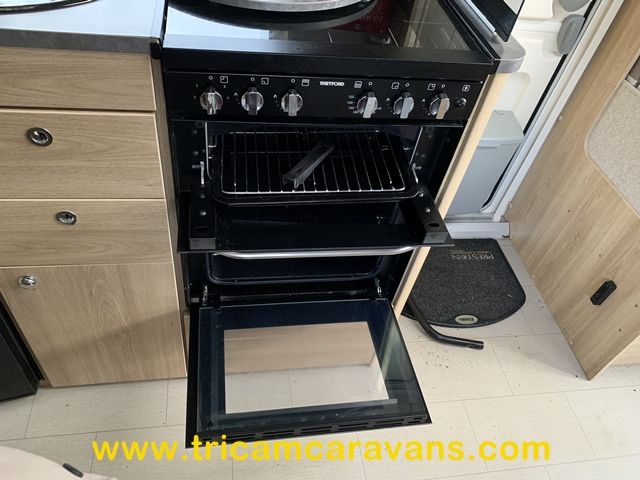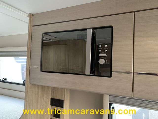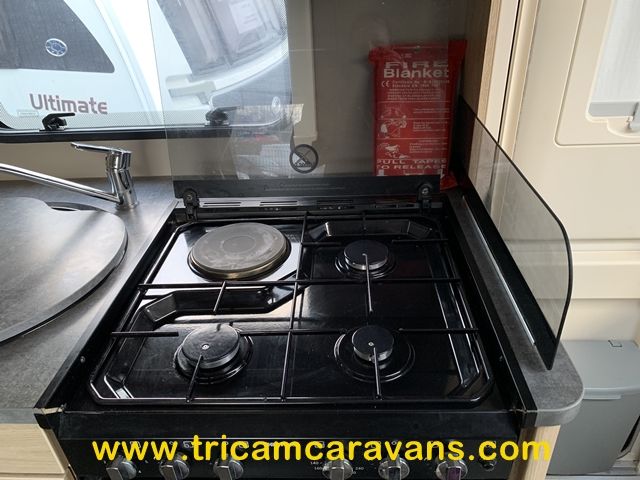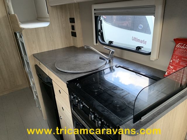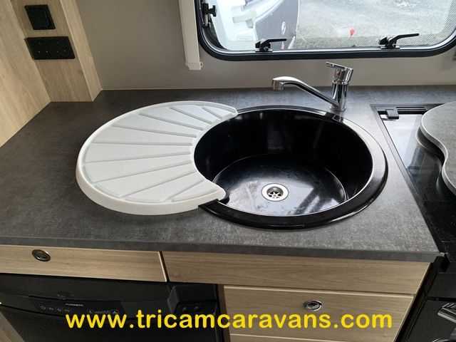 A fully-equipped centre kitchen includes a 3-way fridge, a full cooker with a dual fuel hob, a built-in microwave, a large circular sink with removable cover and drainer, and ample storage and worktop.