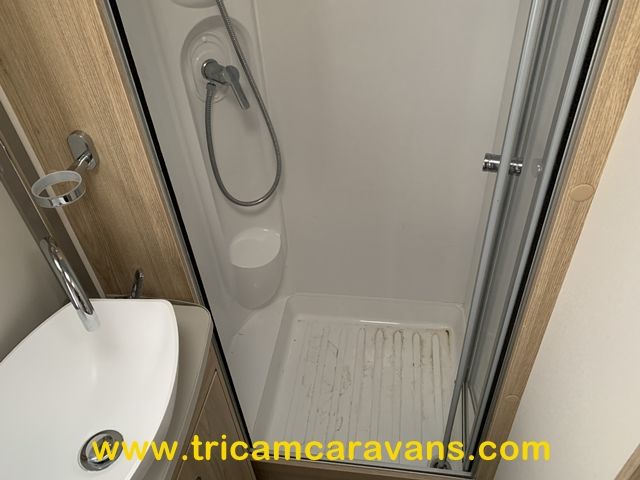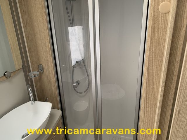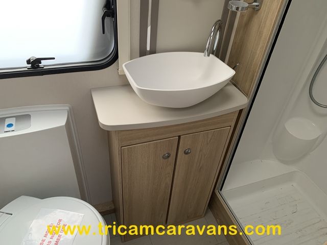 The offside end washroom features a separate shower cubicle, a swivel cassette toilet, a wash basin, cabinets for toiletries, a side window, and a roof light.